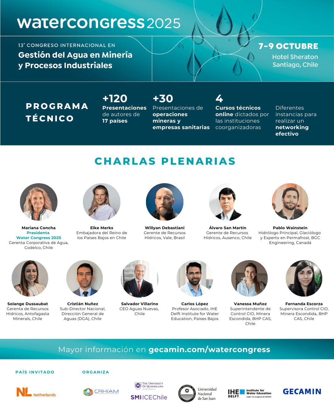 Water Congress 2025 se proyecta como un encuentro clave para avanzar en una gestión del agua más responsable dentro de la industria global. Las inscripciones aún están abiertas en el sitio oficial: www.gecamin.com/watercongress.
